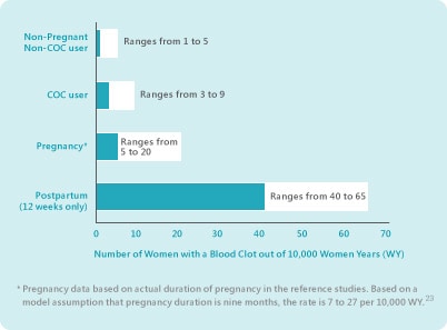 低雌激素劑量(少於50微克ethinylestradiol)的避孕藥使用者相比沒有懷孕及沒有服用混合口服避孕藥的婦女,靜脈血栓栓塞的整體風險高兩至三倍,並維持低於懷孕及生育時的風險。7,22,23